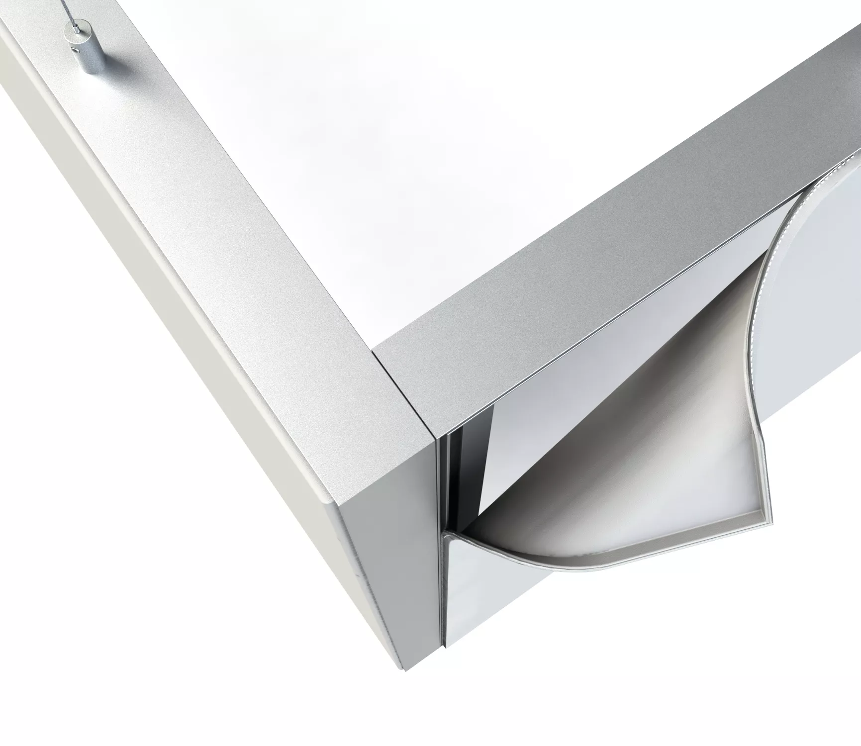 Mocowanie w systemie SEG (gumka silikonowa) – szybki montaż i idealne napięcie tkaniny.