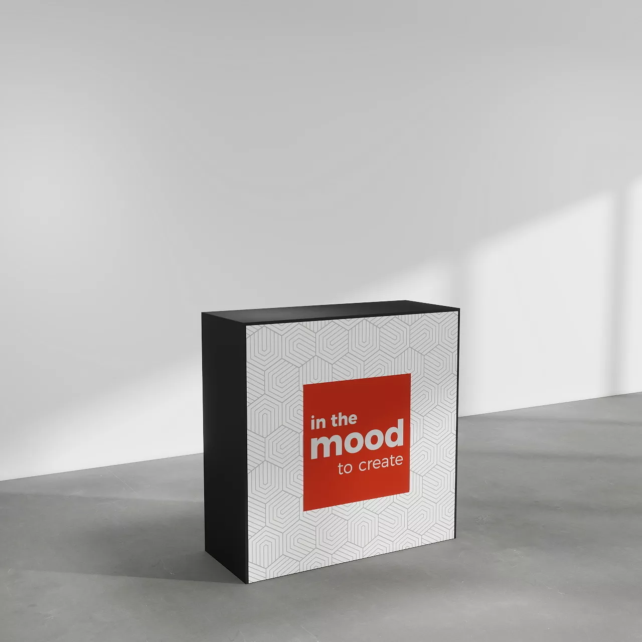 Dieses Modell kombiniert die Ästhetik **weißer HPL-Platten mit einem kontrastierenden schwarzen Kern** – ein Detail, das den technischen Charakter des Produkts unterstreicht. Die Vordergrafik ist auf **Blockout Nero Gewebe** gefertigt, das das Durchscheinen von Licht eliminiert und eine vollständige Abdeckung gewährleistet. Die gesamte Konstruktion ist auf einem **Textile Frame** aufgebaut, und eine interne Ablage erleichtert die Raumorganisation.