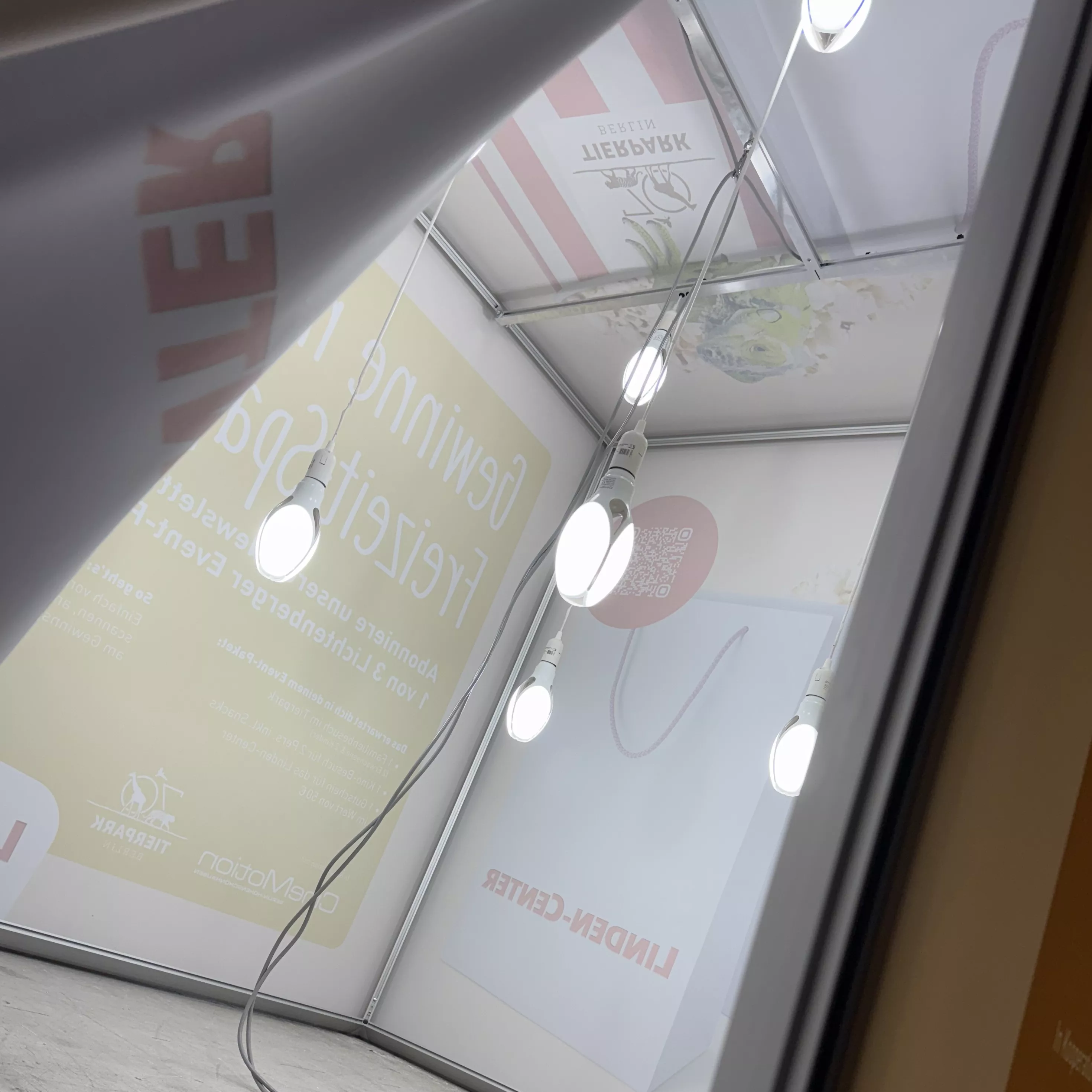 Podwieszenie FBox LED 200×100×100 cm to prostokątna wersja sześciennej konstrukcji, zapewniająca dużą powierzchnię ekspozycji przy zachowaniu lekkiej formy. Dzięki systemowi podświetlenia LED grafika staje się intensywna i doskonale widoczna z daleka, co czyni ten model idealnym wyborem na targi i eventy, gdzie kluczowa jest wyrazista identyfikacja marki.