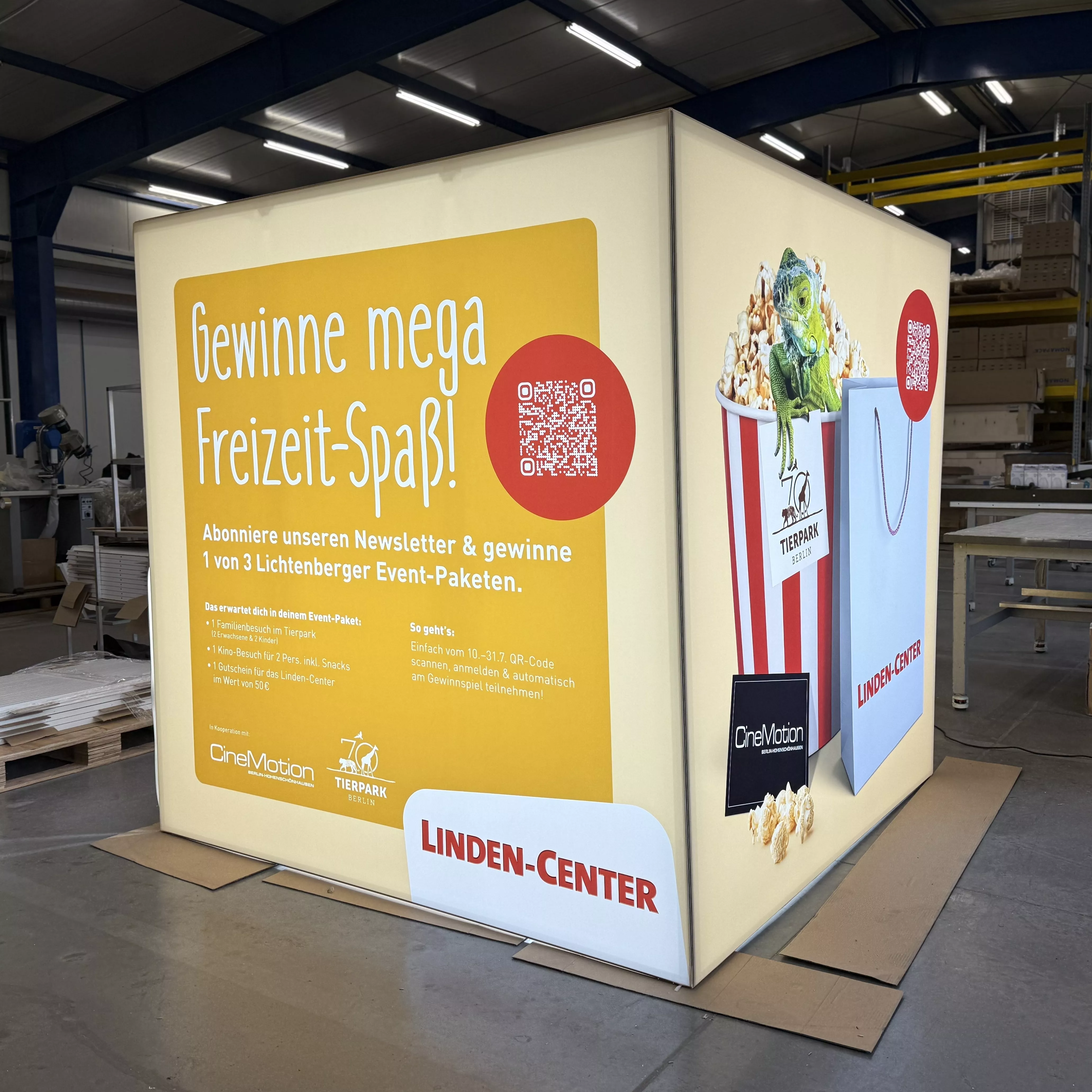 Podwieszenie FBox LED 200×200×100 cm to średniej wielkości konstrukcja sześcienna, łącząca dużą powierzchnię ekspozycji z mocnym efektem świetlnym. Dzięki wewnętrznemu systemowi LED grafika jest intensywna, wyrazista i widoczna z dużych odległości. Ten rozmiar szczególnie dobrze sprawdza się na stoiskach średnich i dużych, gdzie wymagane jest silne wyróżnienie w przestrzeni targowej.