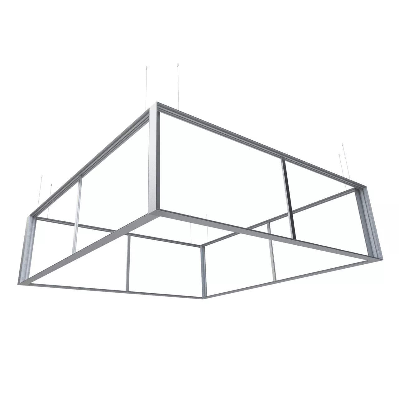 Kwadratowe podwieszenie z profilu 50 mm – kompaktowy format i grafika po obu stronach ram