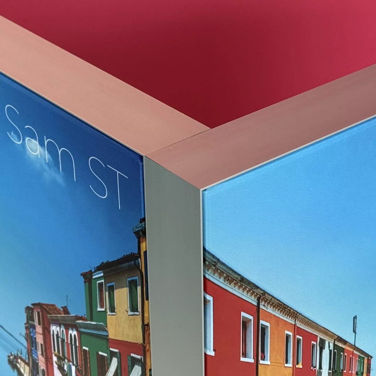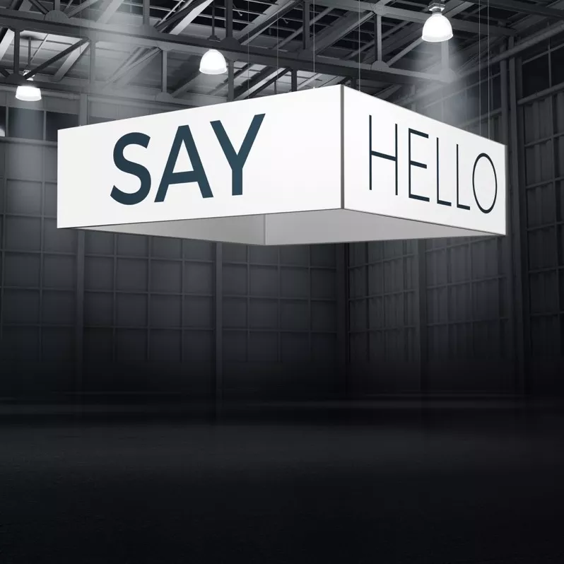 Podwieszenie Smart Frame S4 S50 o wymiarach 300×300×100 cm w wariancie łączenia prostego to solidne rozwiązanie do średnich i dużych stoisk. Cztery ramy aluminiowe tworzą zamknięty kwadrat, a po dwóch stronach widoczny jest profil 50 mm. Grafika tekstylna nakładana jest po obu stronach ram – na zewnątrz i od wewnątrz – co zapewnia pełny efekt wizualny w całej przestrzeni podwieszenia.