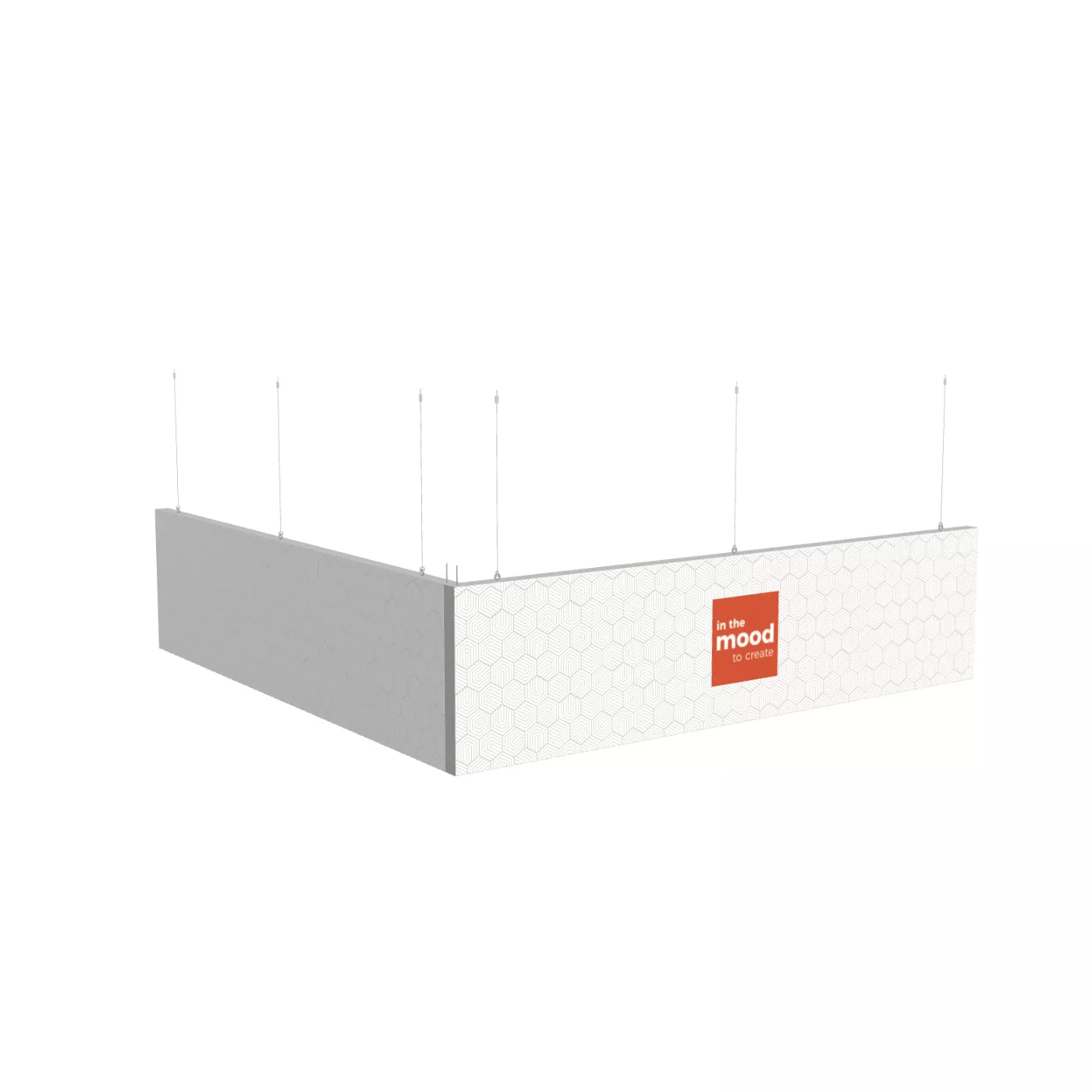 Podwieszenie w układzie „L” – dwie ściany graficzne, otwarta konstrukcja i równomierne podświetlenie LED