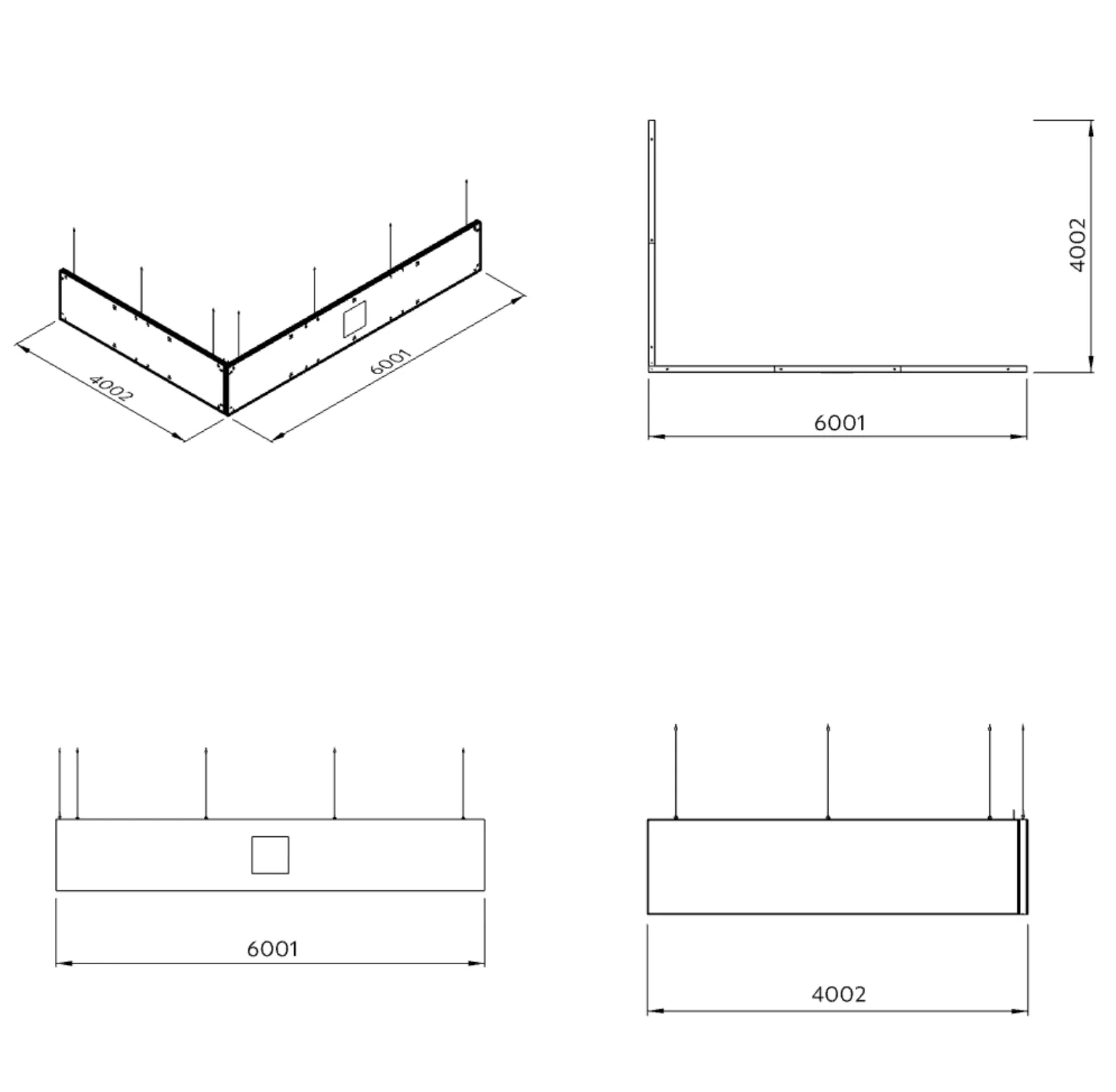 Podwieszenie Smart Frame S2 S100LED o wymiarach 400×600×100 cm to wariant w układzie „L”, w którym konstrukcja obejmuje dwie ramy połączone pod kątem prostym. Otwarta forma umożliwia umieszczenie podwieszenia w narożnikach stoisk lub w przestrzeniach, gdzie liczy się widoczność z dwóch kierunków. Dzięki dużej powierzchni graficznej i podświetleniu LED system zapewnia wysoką rozpoznawalność marki oraz nowoczesny efekt wizualny.