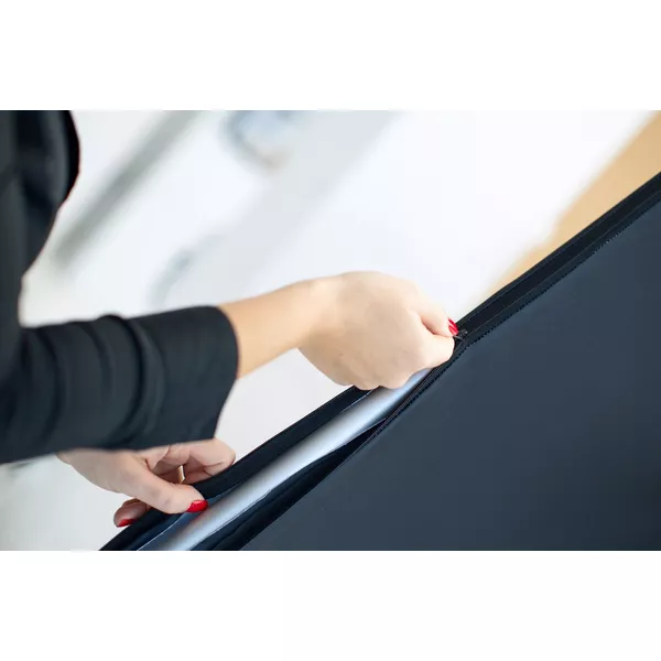 Ścianka jest wyposażona w pokrowiec z elastycznej tkaniny Decor Stretch, która pełni funkcję grafiki. Materiał ten jest lekko rozciągliwy, co pozwala na jego idealne napięcie na konstrukcji, eliminując fałdy i zmarszczenia. Pokrowiec zakładany jest na całą konstrukcję i zapinany od dołu na zamek błyskawiczny, co dodatkowo napina grafikę i zapewnia estetyczne wykończenie.