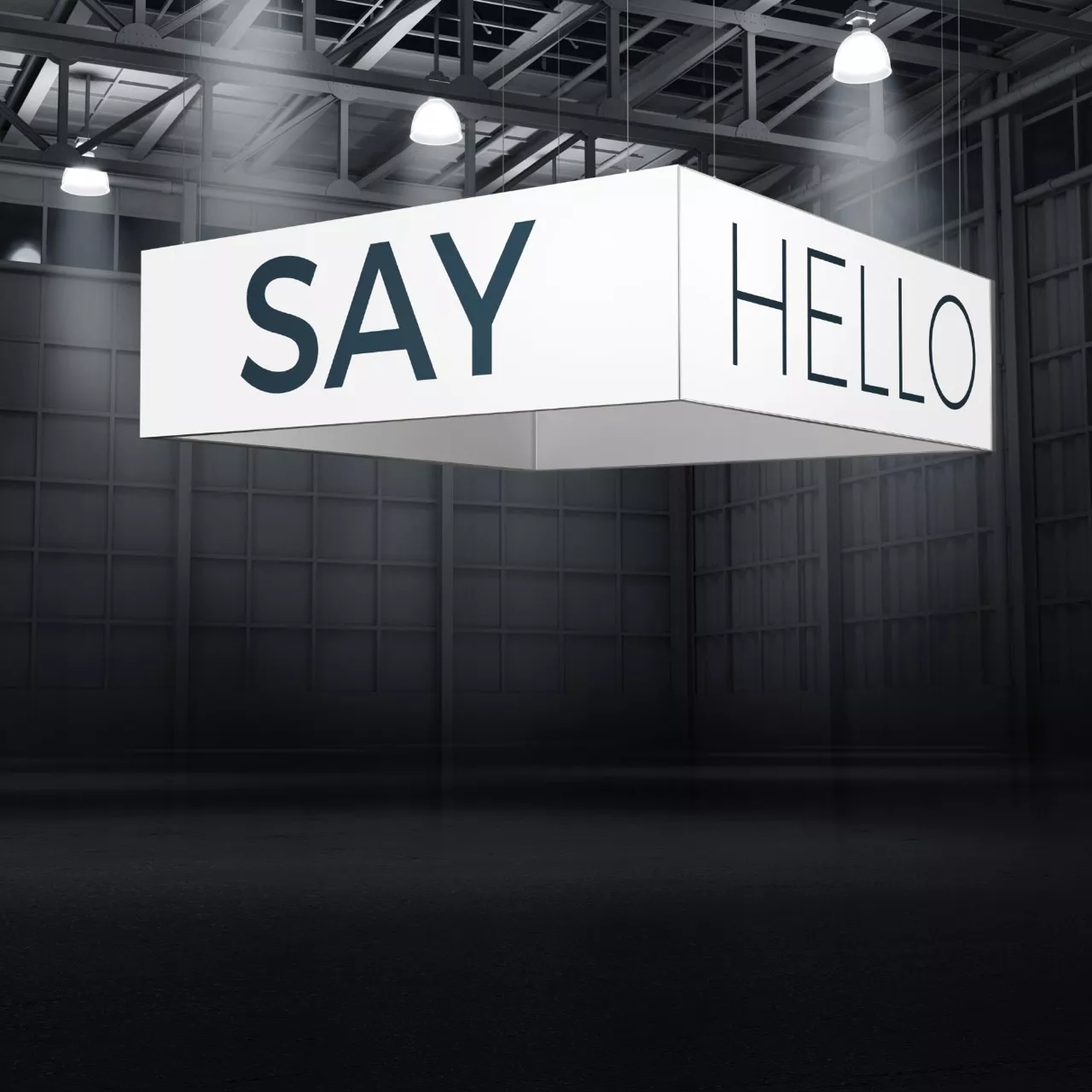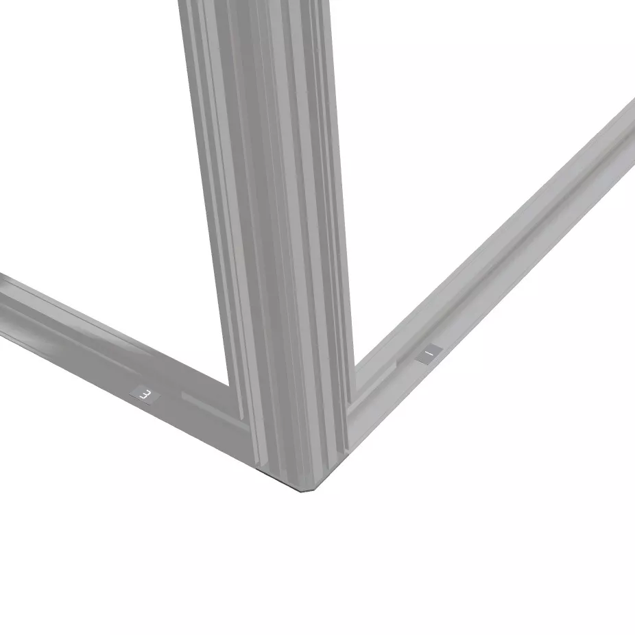 Podwieszenie Smart Frame S4 S50 o wymiarach 500×500×100 cm w wariancie łączenia narożnego gwarantuje płynną ciągłość grafiki na całym obwodzie. Dzięki słupkom narożnym z podwójną nutą tkanina wpina się bezpośrednio w narożniki, co eliminuje widoczne przerwy i zapewnia jednolitą ekspozycję widoczną z każdej strony hali.